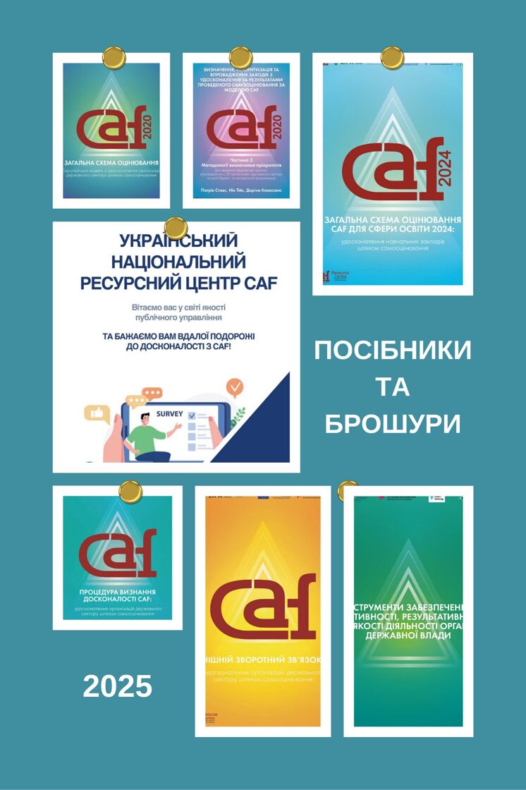 У розділі "Бібліотека" представлені останні видання Центру, зокрема: брошура "Український національний ресурсний CAF" та україномовні переклади посібників ЕІРА щодо європейської моделі CAF 2020, її галузевої версії для сфери освіти CAF Education 2024, процедур визнання досконалості та зовнішнього зворотного зв'язку CAF, а також ключове видання Центру - оновлений посібник "Інструменти ефективності, результативності та якості діяльності органів державної влади".