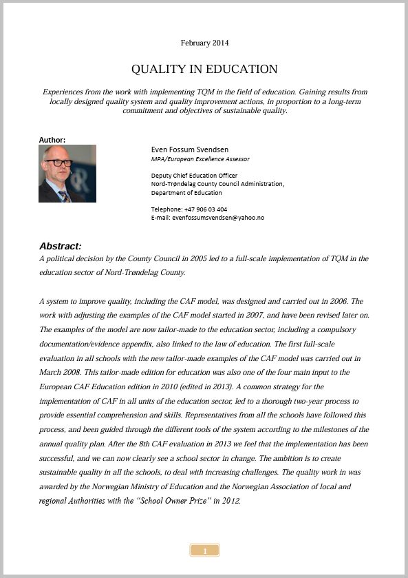 - Евен Фоссум Свендсен (2014). Якість в освіті: досвід роботи з впровадженням загального управління якістю (TQM) у сфері освіти. Отримання результатів від локально розробленої системи якості та дій з підвищення якості, пропорційно довгостроковим зобов'язанням та цілям сталої якості (англ. мовою)