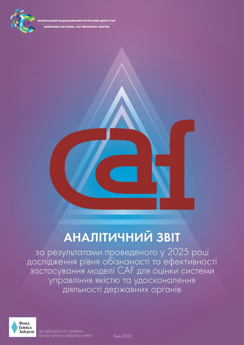 В аналітичному звіті представлено результати комплексного дослідження рівня обізнаності державних службовців та ефективності застосування моделі «Загальна схема самооцінювання» (Common Assessment Framework, CAF) як інструменту оцінки системи управління якістю та удосконалення діяльності державних органів України. Дослідження базується на кількісному й якісному аналізі результатів анкетування учасників процесу самооцінювання CAF, зокрема членів робочих груп, координаторів та залучених фахівців.